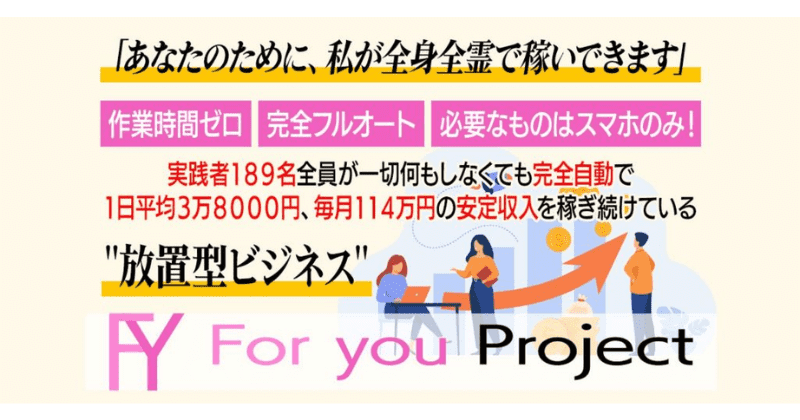 「フォーユープロジェクト for you project」は、完全自動で1日平均3万円強、月収144万円の安定収入を稼ぎ続ける放置型ビジネスです。