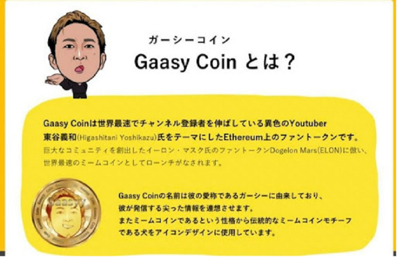 ガーシーコインとは、世界最速でチャンネル登録者を伸ばしているYoutuber東谷義和氏をテーマにした仮想通貨として紹介されています。