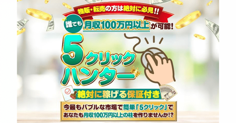 そんな簡単に転売や物販だけで月収100万円を稼ぐことができるという噂の「5クリックハンター」について今回は調査を行ってみました。