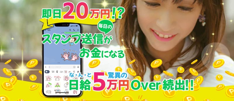 毎日のスタンプ送信がお金になる副業とのことで、即日20万円も稼げる可能性があるんだそうです。