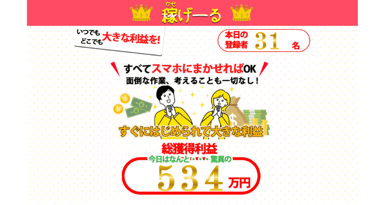 ランディングページ(LP)によれば、『稼げーる』はいつでもどこでもスマホ1つで大きな利益を得られると言う副業です。