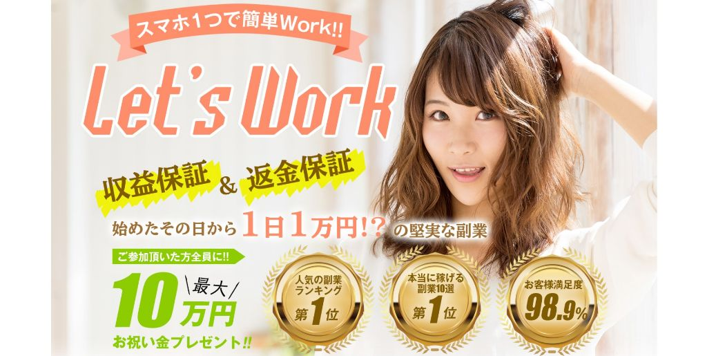 Let’s Work(レッツワーク)は初日から1日1万円が稼げるという簡単スマホ副業です。