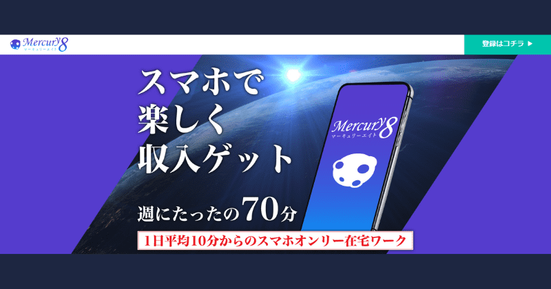 Mercury8/マーキュリーエイトは「スマホで楽しく収入ゲット」を謳う在宅ワーク副業で、1日平均10分という短時間のうちに稼ぐことができるとされています。