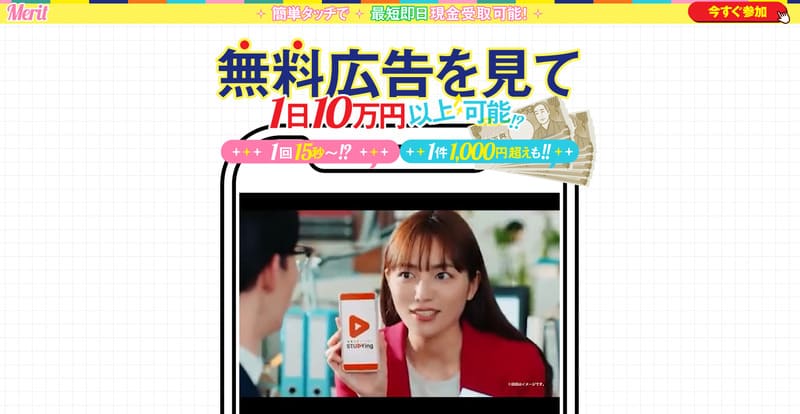 Merit(メリット)とは、スマートフォンでCMを視聴するだけで1回につき1,000円以上もらえるという即金性のある副業です。