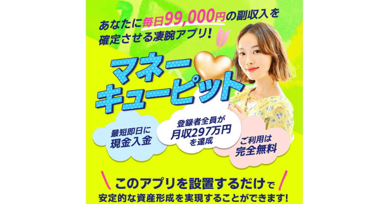 マネーキューピットは、毎日99,000円の副収入を確定させてくれる凄腕アプリだそうです。