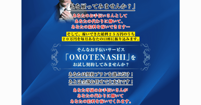 OMOTENASHI/おもてなしとは「お手伝いサービス」のことで、私たちの給料を私たちの代わりに稼いでくれるという内容になっています。