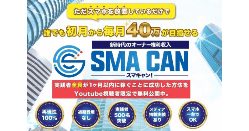 SMACAN/スマキャンは、「ただスマホを放置しているだけで誰でも初月から毎月40万円が目指せる新時代のオーナー権利」という紹介をされている副業案件になります。