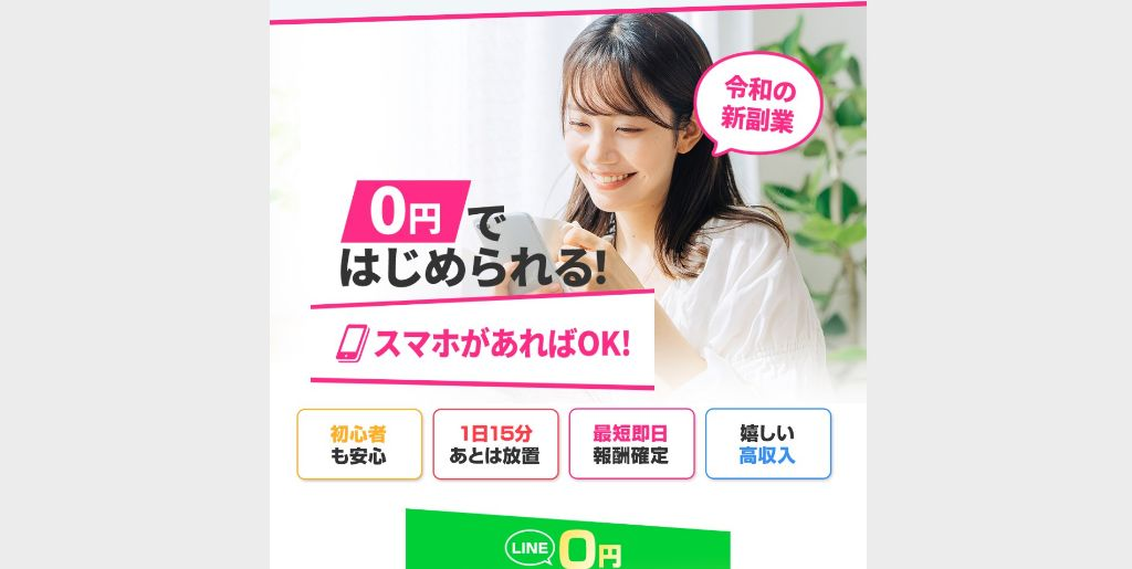 本案件は令和の新副業ということで、スマホがあれば0円ではじめられる副業を謳っています。