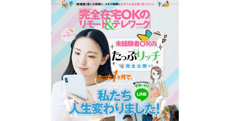 たっぷリッチは、完全在宅&完全未経験でも最高月収60万円を稼げるスマホ副業です。