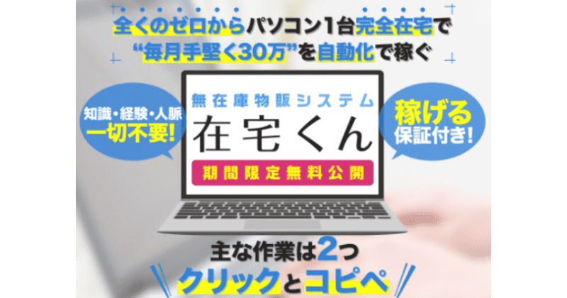 在宅君は、株式会社BANKER6が展開する副業サービスのことで、無在庫物販システムを利用してパソコン一台で月30万円を稼ぎ出すシステムになっています。